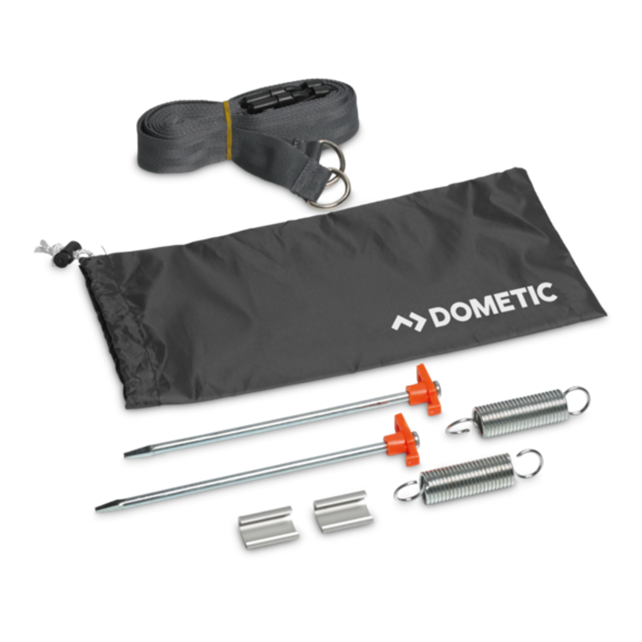 The Dometic tie down kit consists of strong, adjustable straps with robust clasps. The coil springs relieve the strain in windy conditions, secured between the tension straps and the strong ground pegs. The awning kit is supplied in a fabric bag, ensuring the components are kept together, ready for use.