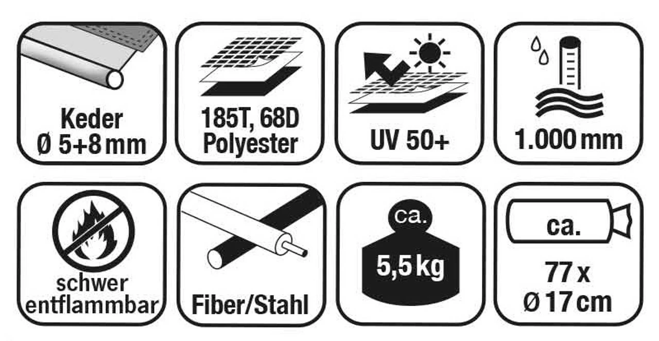 Reimo have equipped this sun canopy with 100% 185T Ripstop polyester, ensuring it is durable enough for your next journey. The fabric provides a hydrostatic head of 1000mm, so no need to worry about passing showers. The fabric also has a high UV protection rating and is fire resistant.